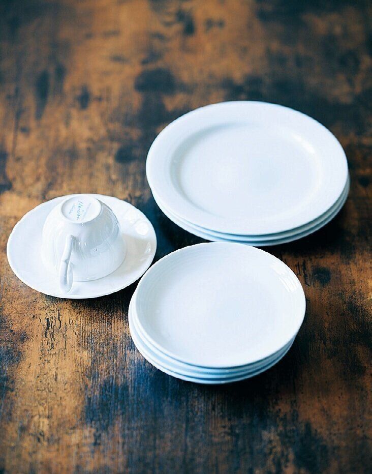 ノリタケのアウトレットで買った1枚1000円ほどの白い食器をフル活用。「丈夫で欠けず、定番品なので買い足しもできる。朝はパン、夜はおかずと何をのせても合い、コスパ最高です」。