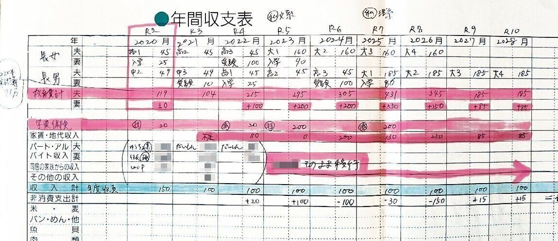 毎年、特別出費の予定表、やりたいことリストを記入。さらに教育費のピーク時にかかるお金を予測した一覧表(上)も。「この時期にはこの貯蓄を回そう」とプランが立てやすく、「足りなくなるかも?」という不安がなくなりました。