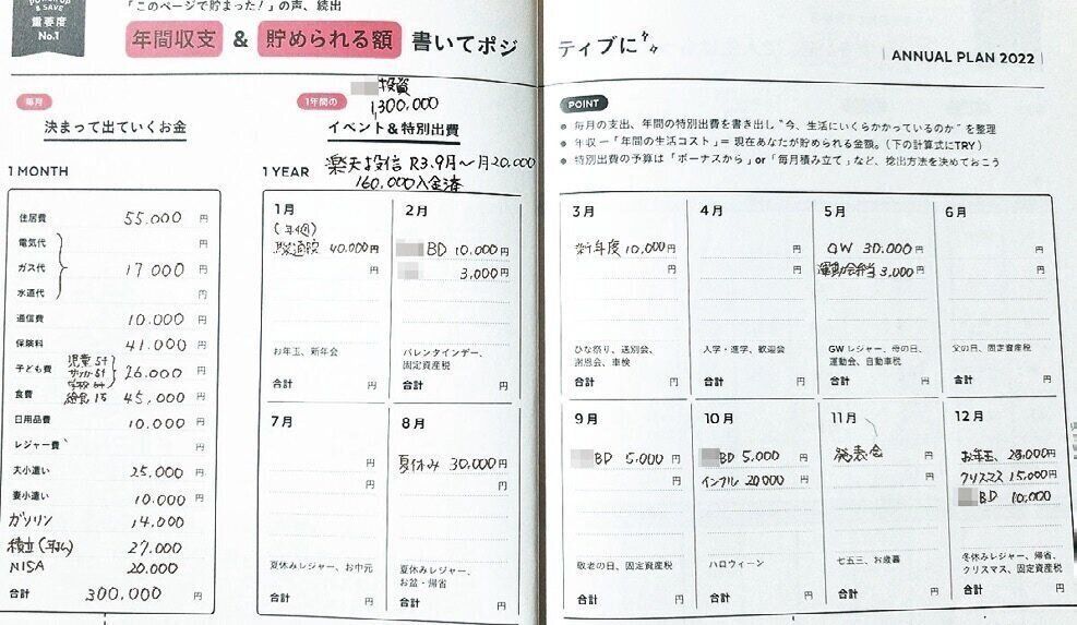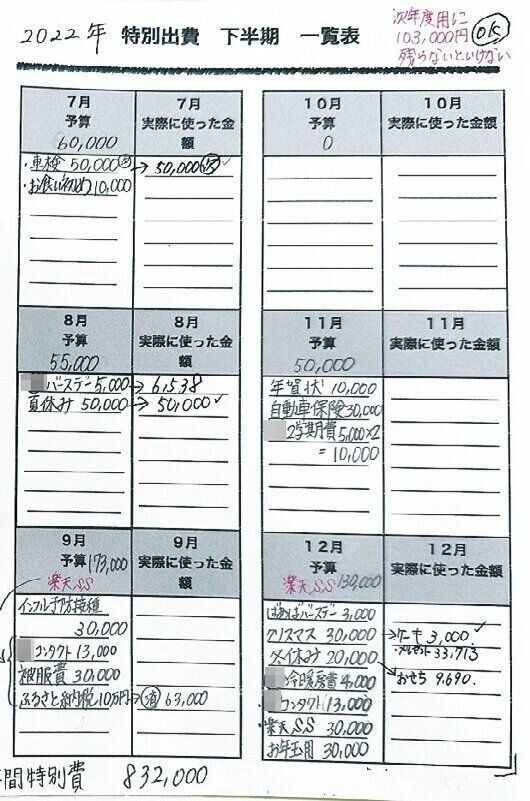 月ごとに、特別出費の予算と実際に使った金額を記入。その差額を調整して翌年の予算を立て、事前に備えているので、貯蓄がキープできます。「"必ずかかるお金"が見えていると、やりくりのモチベーションも上がります!」。
