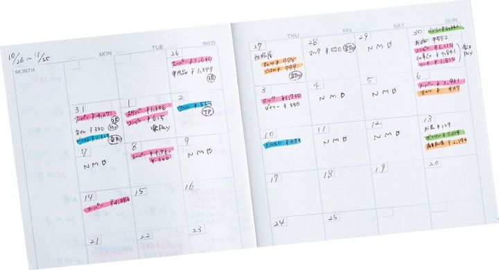 支払い先と金額を記入し、費目をマーカーで色分け。