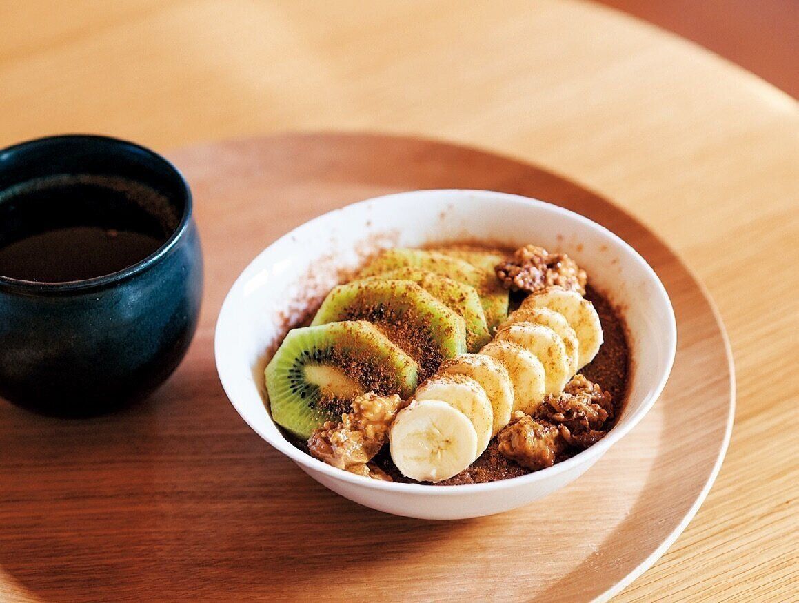 3 好みで、果物、シナモンパウダー、ココア、ピーナッツクリームなどをトッピングする。