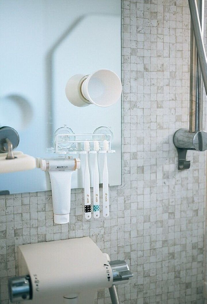 浴室に歯ブラシと歯磨き粉をセット。「子どもと一緒に湯舟につかりながら歯磨きするようにしたら、すみずみまでていねいに磨く習慣が定着。10年間虫歯もできていません」。