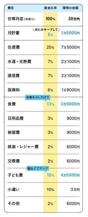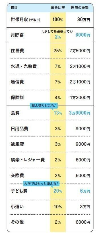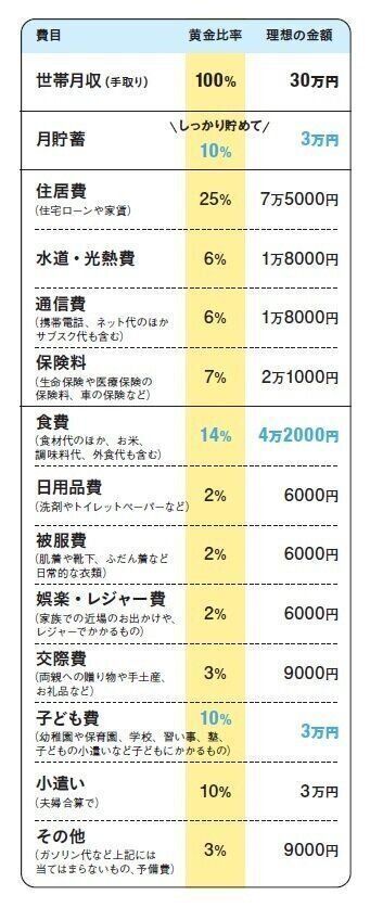 月収に対してひと月の食費や日用品費はどのくらいが適正か、その比率を表したもの。月収(手取り)×各費目の黄金比率(%)で計算すると、理想の予算額がわかります。
