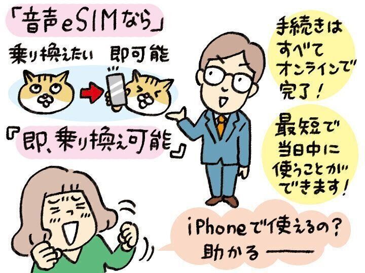 乗り換え自体は、「やったことがないと不安になりますが、案外簡単にできます!」とすずさん。すずさんの場合、「申し込んでからSIMカードが3~4日で届き、装着後、開通の電話や設定をするだけでした」。それでも時間がかからず簡単だと思ったのに、「今なら、音声eSIMで乗り換えれば、私のように、待つ時間もなく最短即日開通可能と聞いてさらにびっくり」したそう。