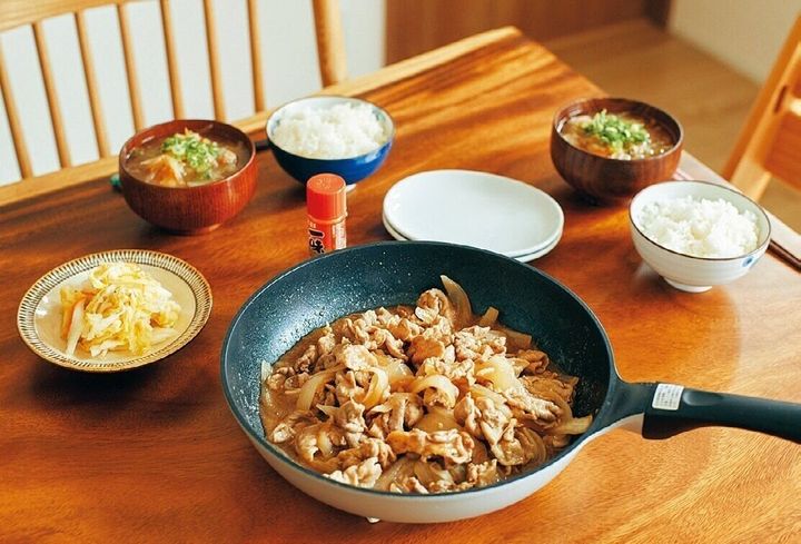 メインは大皿で出すのをやめ、フライパンのまま食卓へ。「盛りつけと皿洗いが減ってラク!汁物は大鍋でつくり、数日キープ。後はご飯と漬け物だけなので、夕飯づくりに疲れません」。