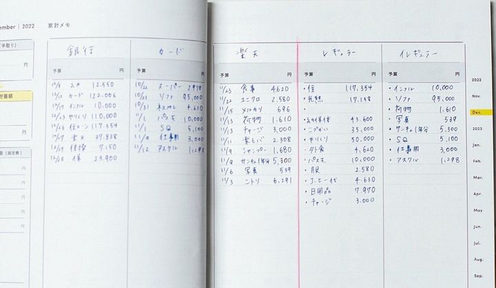 見えにくいカード払いの分だけ書き、レギュラー(生活費)とイレギュラー(特別出費)で集計。「書いて金額を見ると、気が引き締まる。これだけで出費が減りました!」。