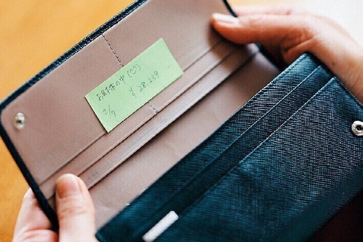 「いろいろ試した結果、現金管理がいちばんラクだと気づいたんです」とCさん。財布の現金=残りの予算。家計簿を書いたら現金の残高をふせんに写し、財布の内側にペタリ。「あといくら使えるか、財布を開くたびに予算を意識できます」。