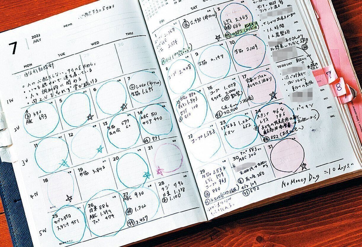細かい家計簿は挫折したので、手帳を活用。「お金を使ったら、カレンダーの日付に店名と金額を記入。週末に、ざっくり費目ごとの集計額を確認するだけで、使い過ぎを防げます」。