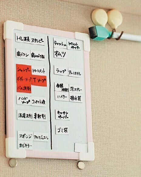 以前は特売品を見ると買わずにいられず、ダブり買いが日常。「日用品の在庫をボードに記入したら、なくなってから買えばいいと気づき、余計な支出が減りました」。