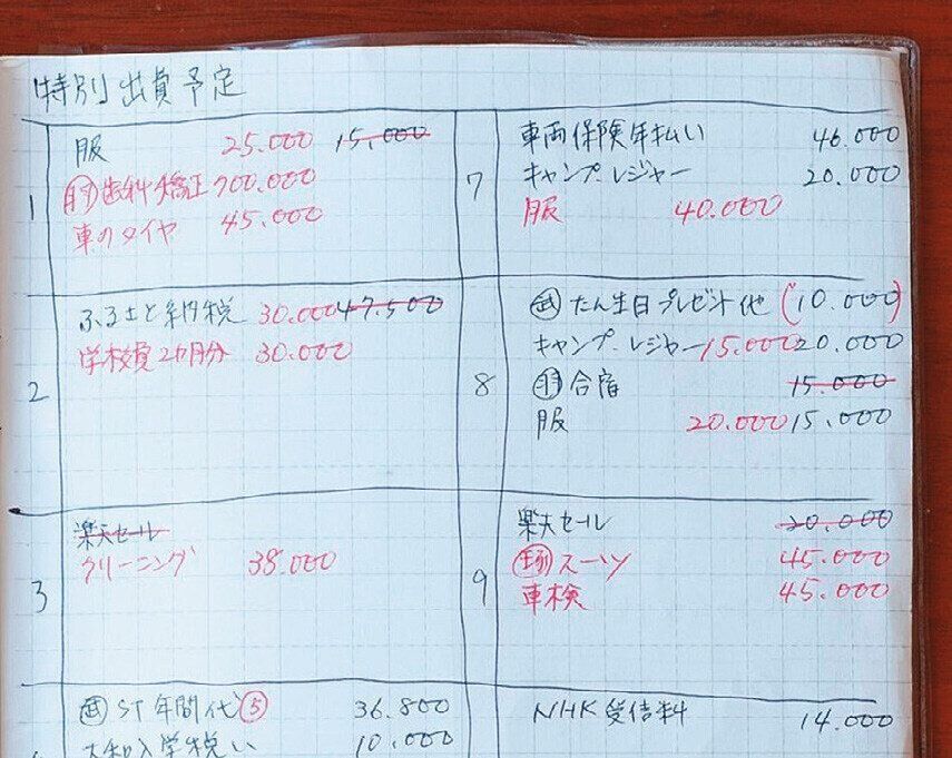 「貯蓄目標を崩さないために、毎年、特別出費を予測して書き出しています」。年末には実際にかかった金額を赤字で記入し、予算とズレがあったところは、翌年の予算変更を。