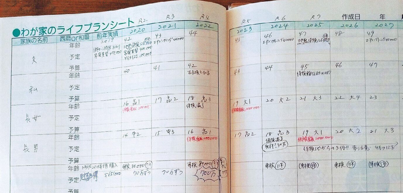 年1回、ライフプランシートに進学や車検の予定などを記入。「毎年状況が変わるので、それに合わせて見直しを。費用も予測して書いておけば、貯蓄プランが立てやすくなります」。