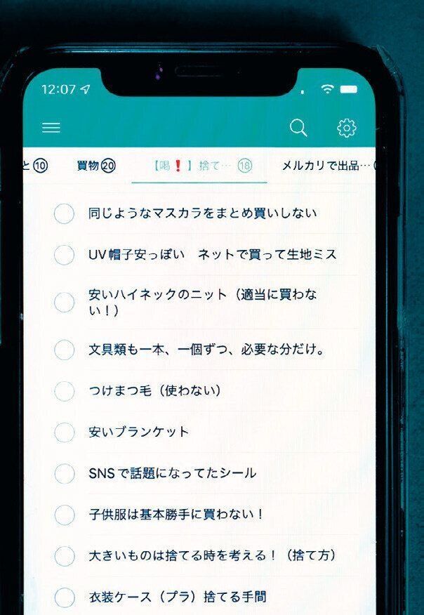 スマホのTo Do Listアプリに「喝!捨てた物」と題したリストを作成。「インスタを開く前にこのリストを見ると物欲がサッと引き、うっかり買いそうな誘惑に負けないように」。
