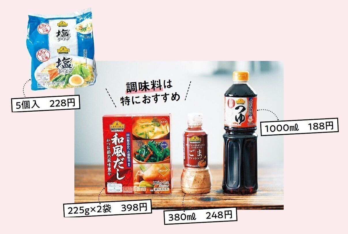 お得パトロールをして行き着いたのが、やっぱりPB商品は安定して安いということ。「調味料や納豆、乾物、練り物などの定番食材は、イオンとドン・キホーテのPB商品を"指名買い"しています」。