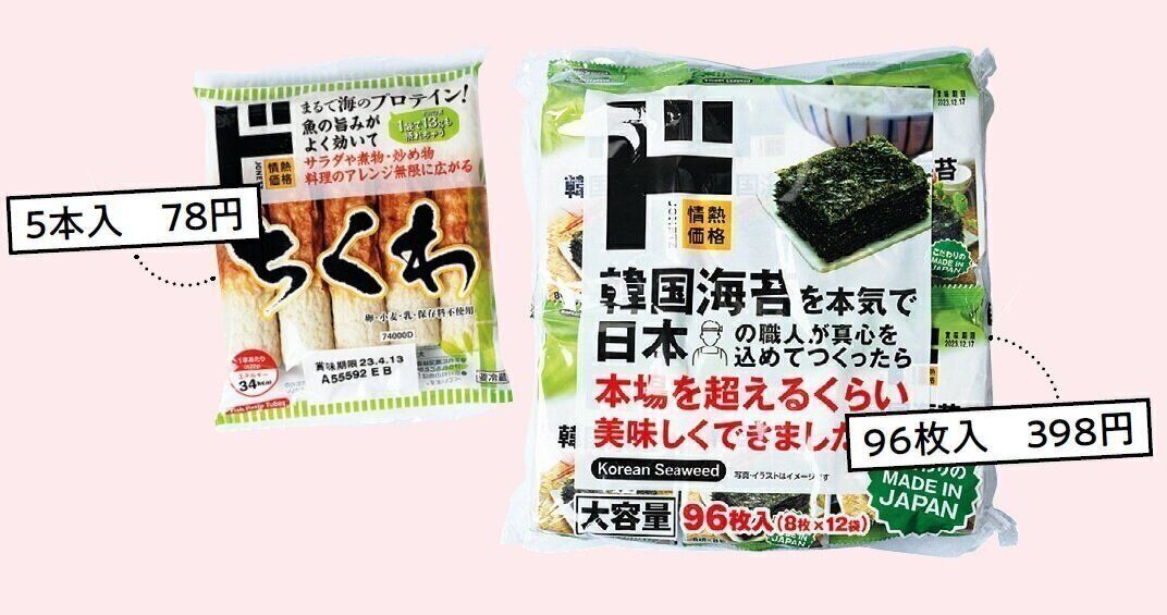 情熱価格シリーズの食品は、続々種類が増えていて狙い目!「わが家では、ちくわ、韓国のりをリピ買い。お菓子やジュースもお得です」。