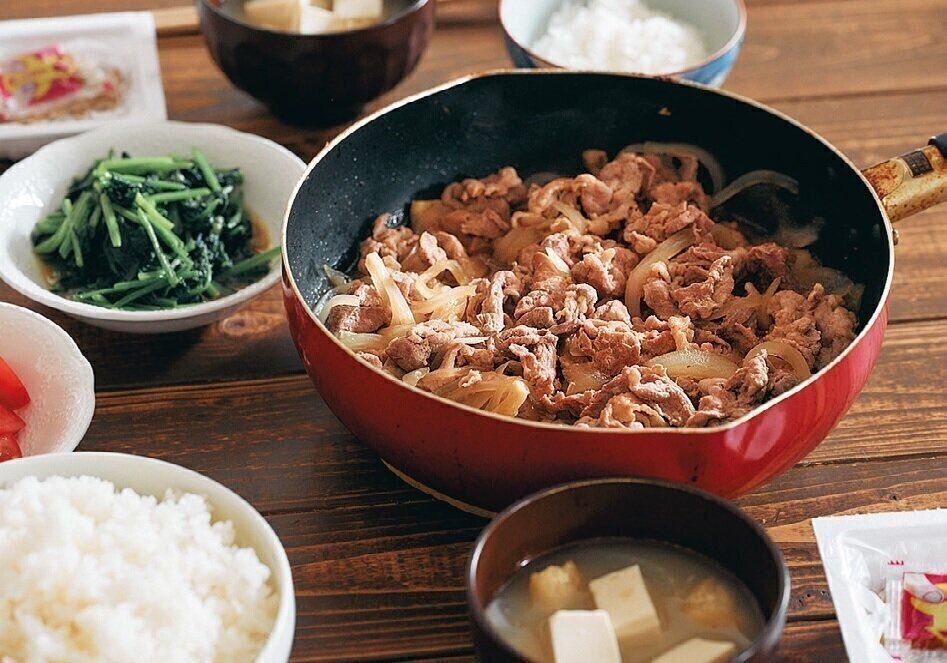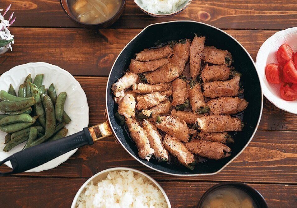 同じ豚こまでも、そのまましょうが焼きにしたり、野菜を巻くなどで変化をつけて。「肉を何種類も買わなくても、お買い得な豚こまだけでOK。見た目を変えれば違うおかずです(笑)」。
