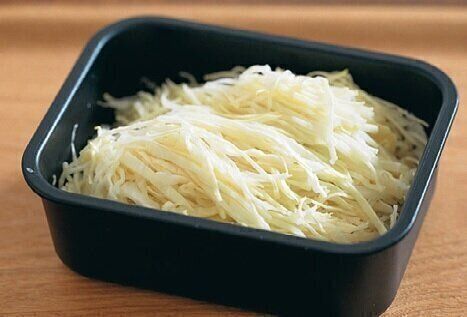 夕飯に炭水化物をとらない夫用にレンチンした千切りキャベツを。値引き品のキャベツはみそ汁の具にも流用して早めに使いきります。