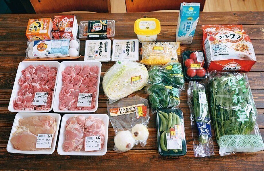 決まって買うのは3日分の主菜用の肉または魚、副菜用の野菜、納豆やキムチなどご飯のお供、豆腐、卵、牛乳、ヨーグルト、夫の朝食用のシリアルなど。野菜は値引き品を活用。これだけ買えばボリューム&栄養バランスはバッチリ☆