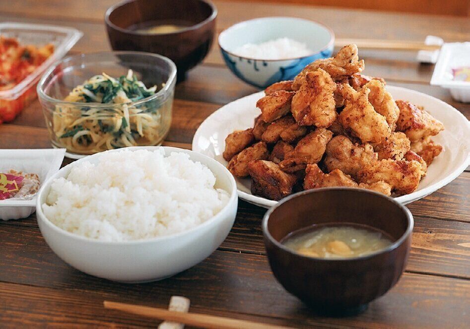 から揚げをド~ンと出せば、肉好き男子はご満悦。傷みの早いもやしは、買ったその日に消費して食品ロスを出しません。キムチと納豆があれば、どんぶり飯も楽勝で完食☆