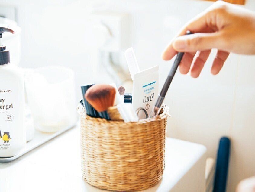 メイクは最小限。コスメは家族共用の日焼け止めとアイブロウを愛用。日用品費から捻出。