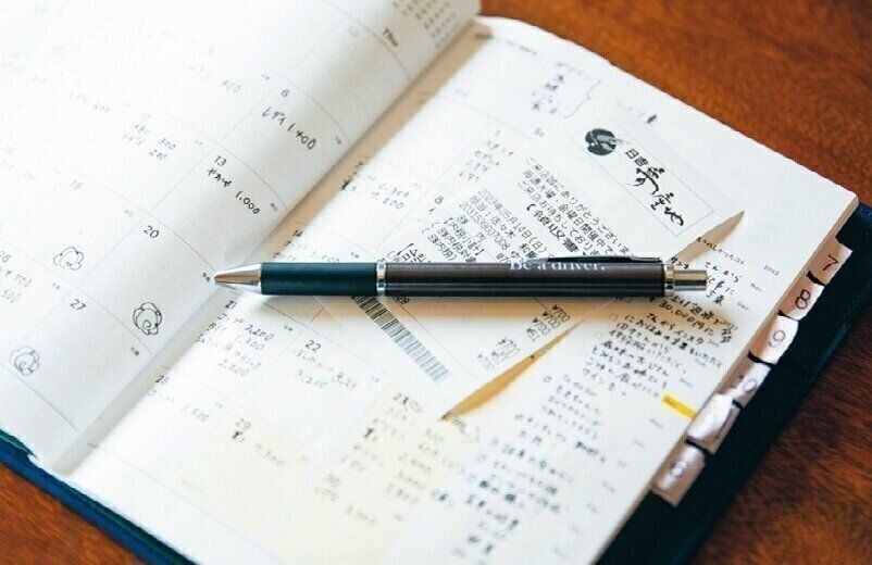 お金を使った日に、買った店と金額を手帳のカレンダー欄にササッと記入。「計算がラクなよう10円以下は四捨五入。書き終わったらレシートは捨てちゃいます」。