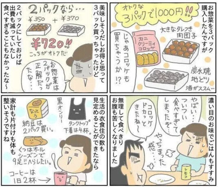 そんな節約上手な松山ルミさんですが、先日、スーパーで「3パックで1,000円」の文字につられてお惣菜を買いました。お得だと思いきや、食べすぎとムダな出費につながってしまったのだそう。3パックで1,000円はたとえお得でも、自分たちには2パックで十分と感じました。