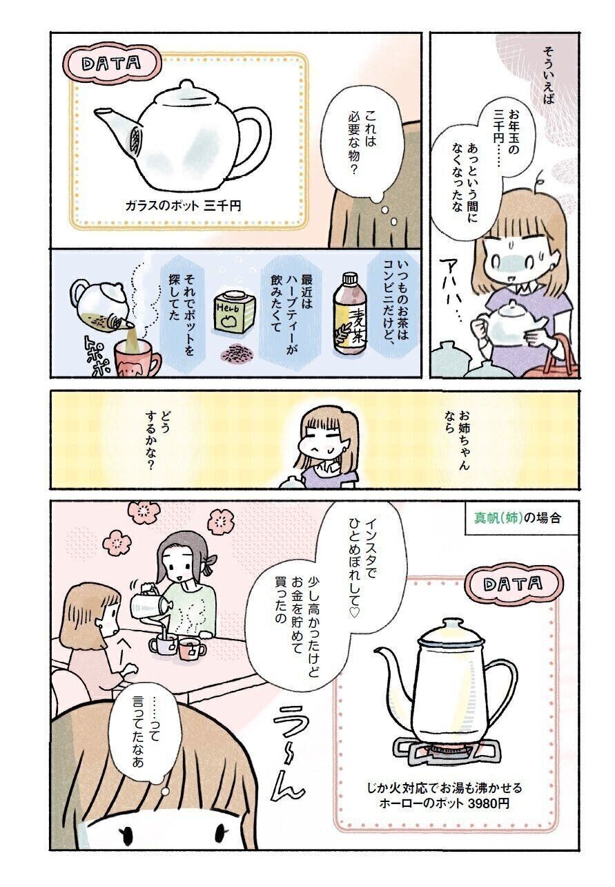 東京のおしゃれタウンで、気ままな1人暮らしをしている主人公・美帆。貯金とは縁遠い毎日を送っていましたが、雑貨屋さんで偶然手にしたティーポットをきっかけに、お金と向き合い始める物語。街で目にした保護犬と暮らすために始めた節約の挫折、100円貯金の成功などなど…。山あり谷ありのお金にまつわる経験を経て、少しずつ貯めマインドを養っていきます。