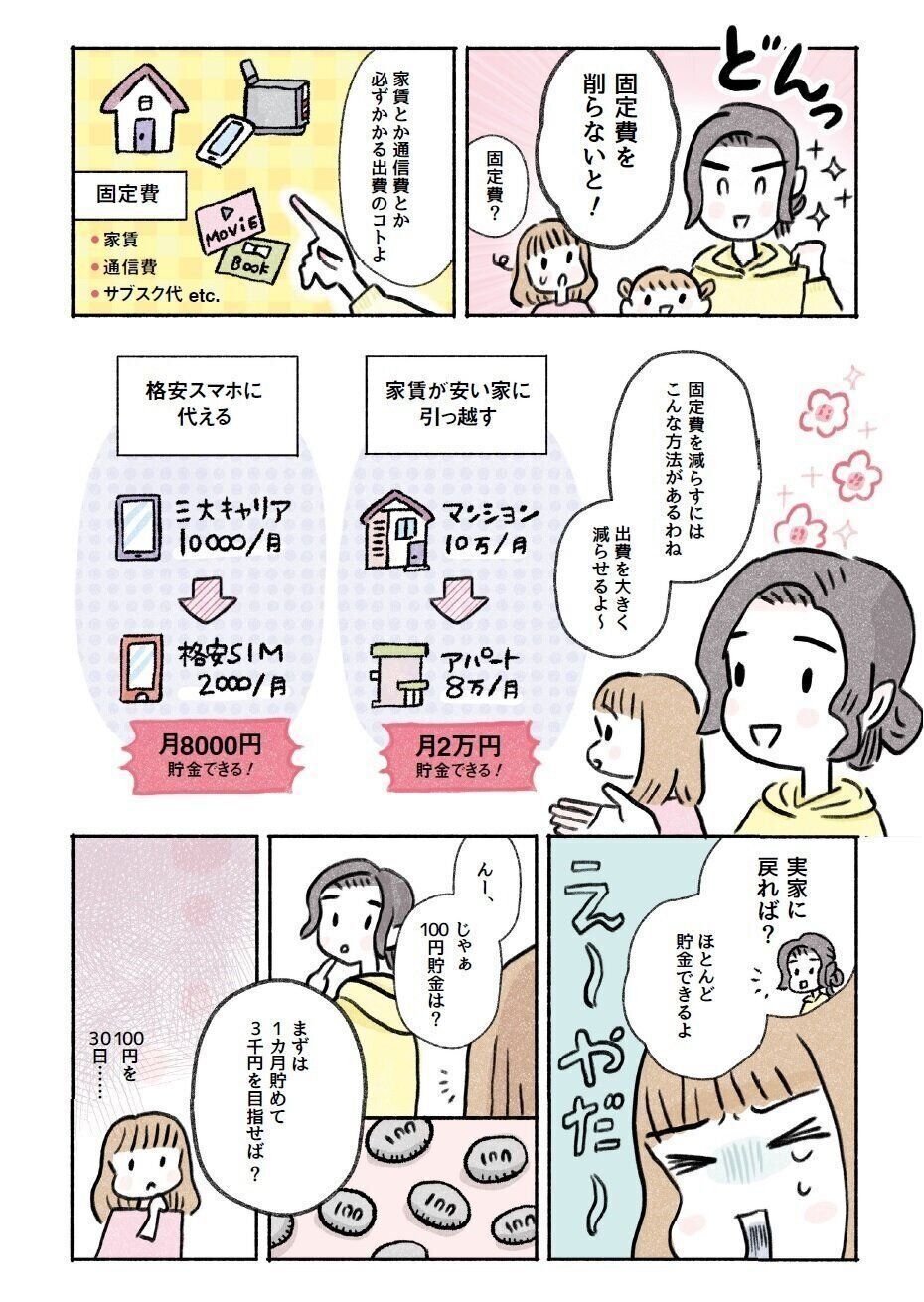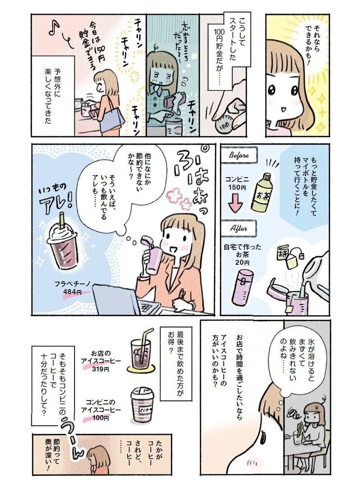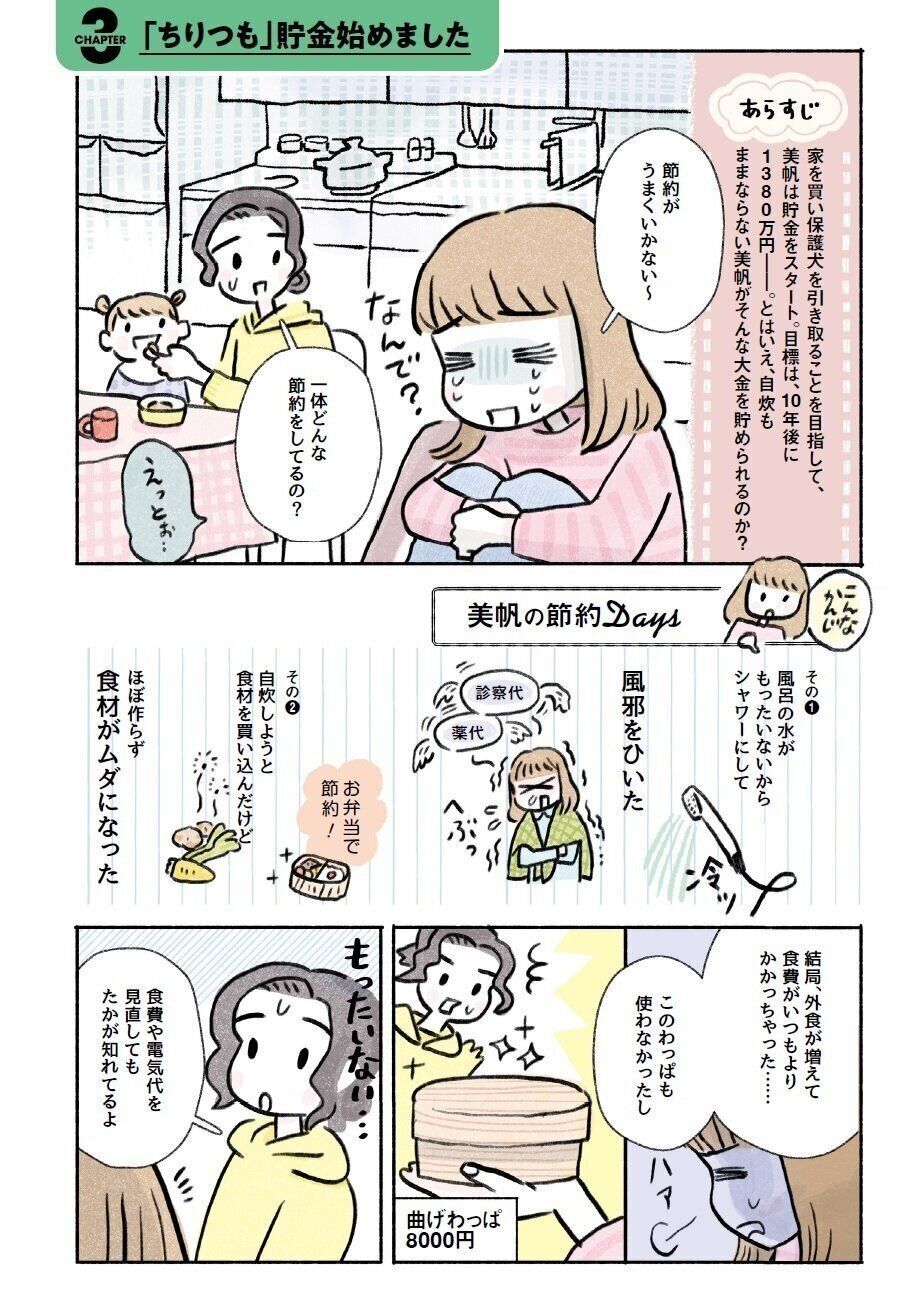 東京のおしゃれタウンで、気ままな1人暮らしをしている主人公・美帆。貯金とは縁遠い毎日を送っていましたが、雑貨屋さんで偶然手にしたティーポットをきっかけに、お金と向き合い始める物語。街で目にした保護犬と暮らすために始めた節約の挫折、100円貯金の成功などなど…。山あり谷ありのお金にまつわる経験を経て、少しずつ貯めマインドを養っていきます。
