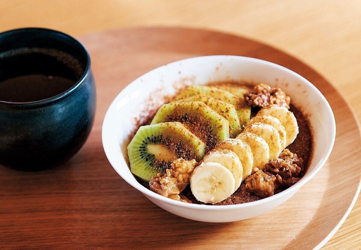 1 耐熱容器に、プロテイン、オートミール(粉末)各30g、ベーキングパウダー、あればサイリウムハスク各3gを入れて混ぜ合わせ、水60ml を加えて粉っぽさがなくなるまで混ぜる。