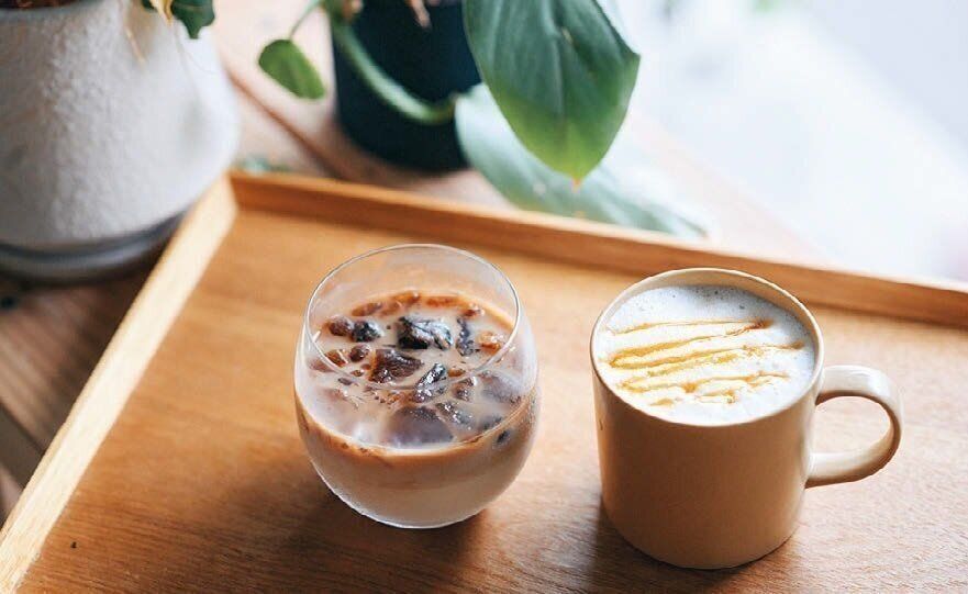 温めた牛乳を100均の電動ミニクリーマーで泡立ててからコーヒーに加え、泡の上にキャラメルシロップをかける。