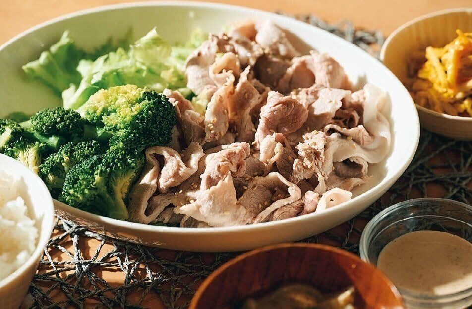 ゆでた豚バラスライスにブロッコリーとレタスを添え、ごまドレッシングのつけだれでいただく。副菜はマッシュしたかぼちゃとごぼうにんじんミックスを混ぜ、マヨネーズ、砂糖、なんでもできるっ酢で味つけ。