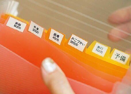 給料日に現金で使う分を下ろし、すぐ仕分け。「費目と金額をラベリングしておけばラク。残金も一目でわかり、使いすぎ防止にも」。