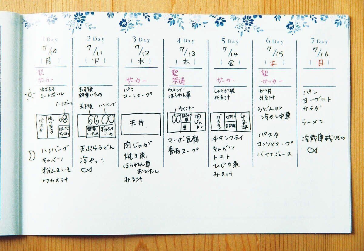 献立はリクエスト方式で、考える手間をカット。「予算内で調整しながら1週間分の献立をノートに整理するのが好き。家族も楽しみにしてくれる上、毎日悩まずに作れて超快適!」。