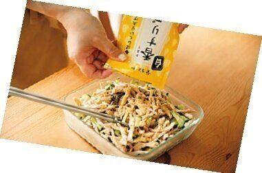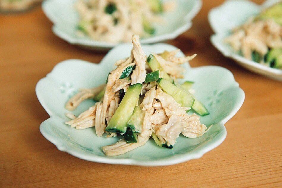 レンチンした鶏ムネを裂き、きゅうりとごま油、鶏ガラスープの素、しょうゆ、マヨであえ、仕上げにすりごまを。「ごまはたんぱく質が豊富。サラダなどの副菜によくかけます」。