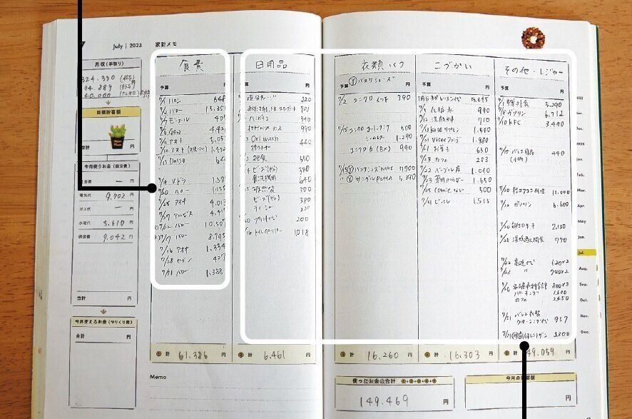 - 食費以外は購入内容も記入。消費のサイクルが把握できる