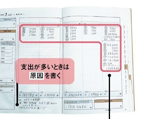 レシートは手帳にはさんでおき、週末にまとめて記入。〇マークで費目を分け、それぞれの合計額を記入するだけなのでお手軽!