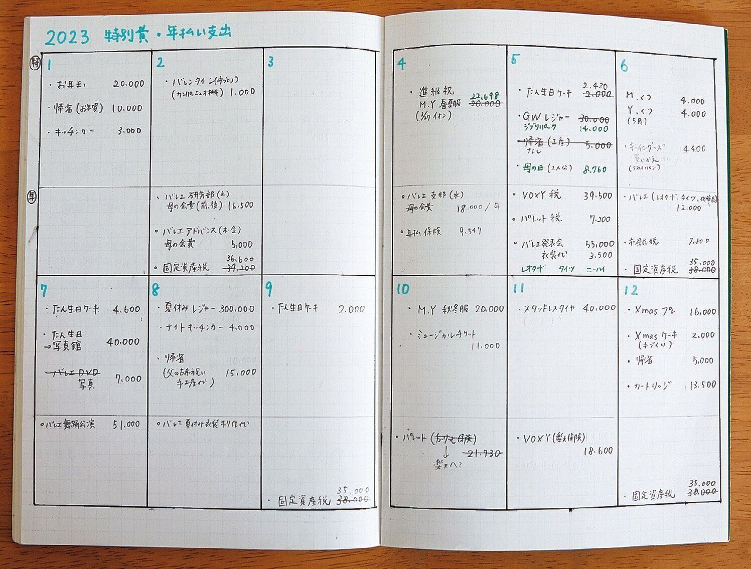手帳(22年版)のフリースペースに枠を書き、月ごとにかかる特別出費の予定を記入。「先読みすることで、出費が増えても慌てずにすみます」。