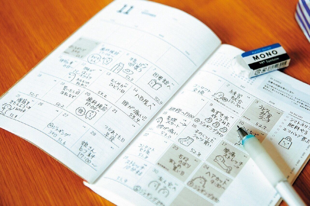 月予定の日付け欄に、その日の体重や生理、頭痛・肩こりなどの不調、運動内容などをメモ。イラスト入りで気分を上げています。