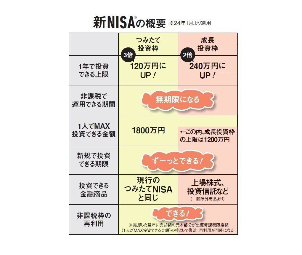 今のつみたてNISAは「つみたて投資枠」として、同じく一般NISAは「成長投資枠」として、新NISAにイン。「つみたて投資枠は、積み立てで買う投資信託がメインで、成長投資枠は株式投資もできます。これまでは2つの制度のどちらかしか選べなかったのが、両方できるように」。つまり、非課税でできる投資の種類が広がり、これまでより柔軟な組み合わせが可能になるんです!