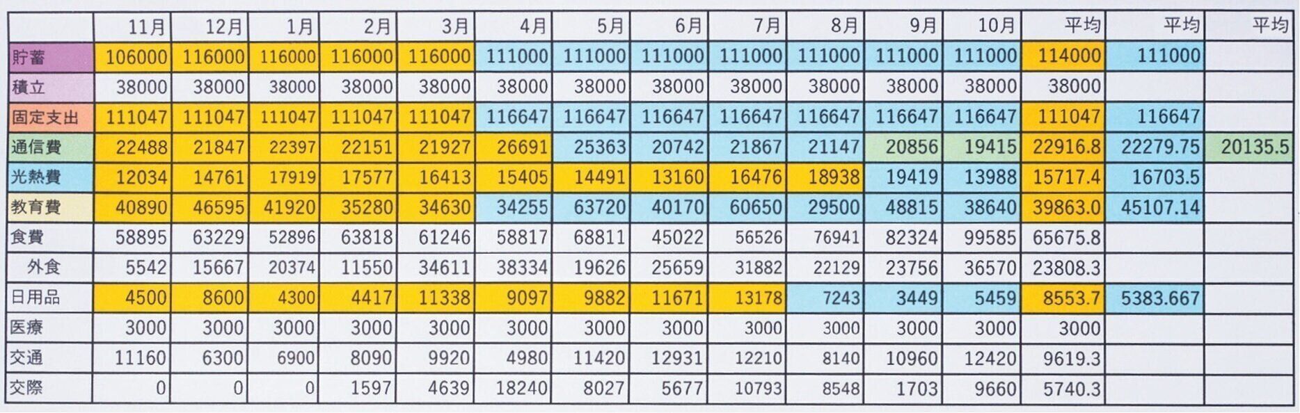 月毎に費目別(貯蓄、積立、固定支出、通信費、光熱費、教育費、食費、日用品、医療費、交通費、交際費)に整理し、年間支出表を作成。