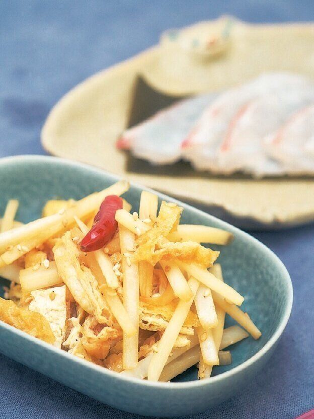 大根の皮150g、油揚げ1枚を細切りにし、赤唐辛子とともにごま油で炒め、酒、しょうゆ、砂糖各大さじ1で調味して、白いりごまをふる。