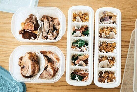 つくりおきを作ったら、そのままおべんとう用に小分け。「5日分のおかずがあっという間に完成」。
