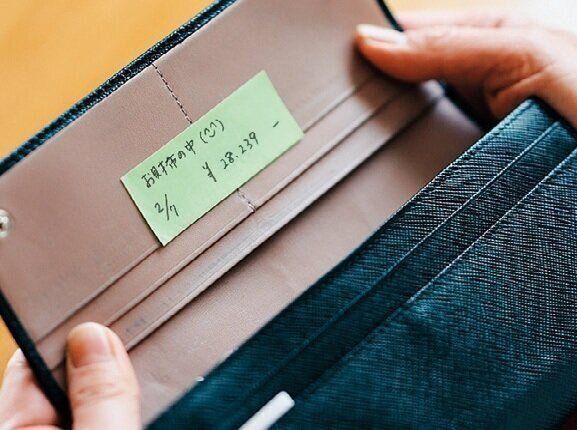家計簿を書くときに、やりくり費の残金を付箋に書いて、財布の内側にペタリ。財布を開くたびに、自分の記憶とWチェックできます。