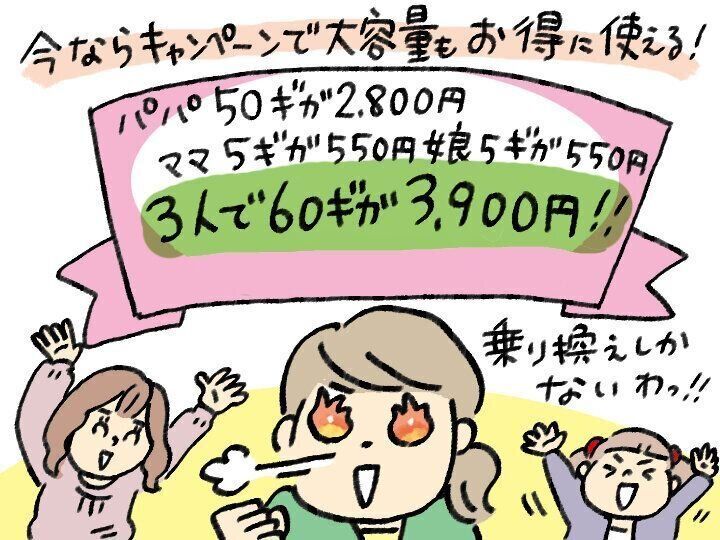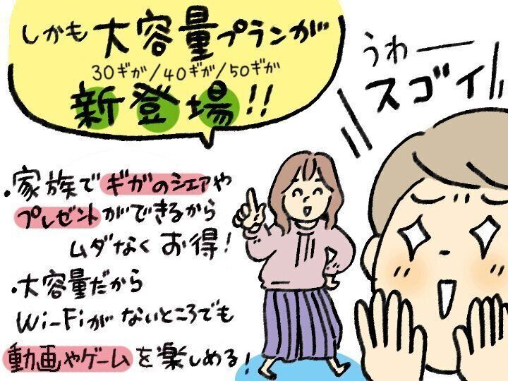 大容量プランなら、家族でギガのシェアやプレゼントができてムダなく使えてとってもお得。また、大容量だからたくさん使えてWi-Fiがないところでも動画を楽しめたりと、いつもの生活がグッと充実します。