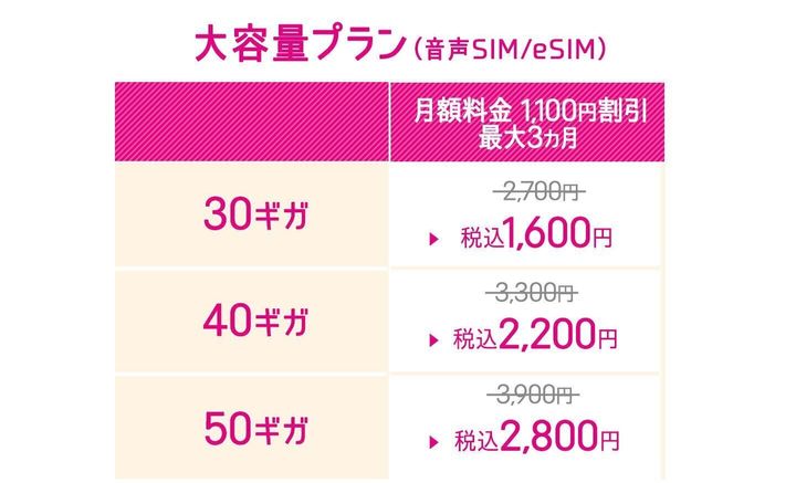 そして、今なら大容量プランもキャンペーン中♪ 音声SIM/eSIMプランなら月額料金は1,100円割引に! いずれも最大3カ月間、よりお得な大容量プランを実感できます。