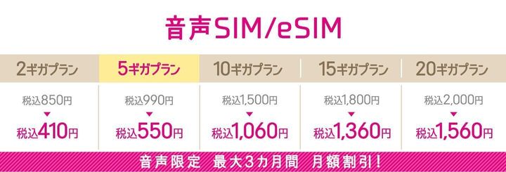 ・ギガプラン通常5ギガ=990円のところ、「サマーキャンペーン【音声SIM月額割引】」で、5ギガ=550円に(音声SIM/eSIMの場合・最大3カ月間)