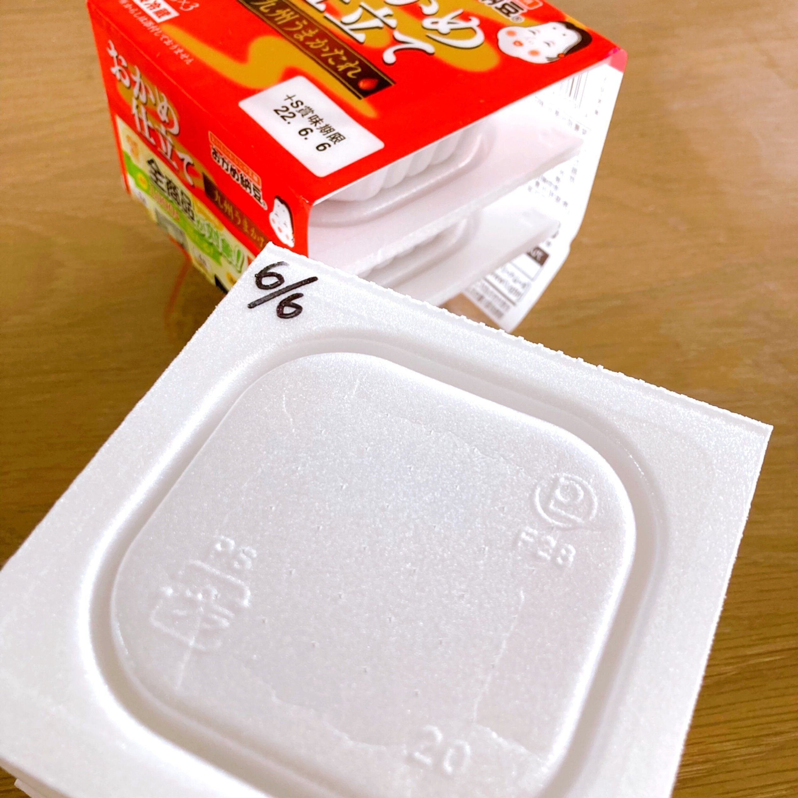 納豆や豆腐など、いくつかまとめてフィルムが巻いてある商品は【フィルムを外し】ましょう。