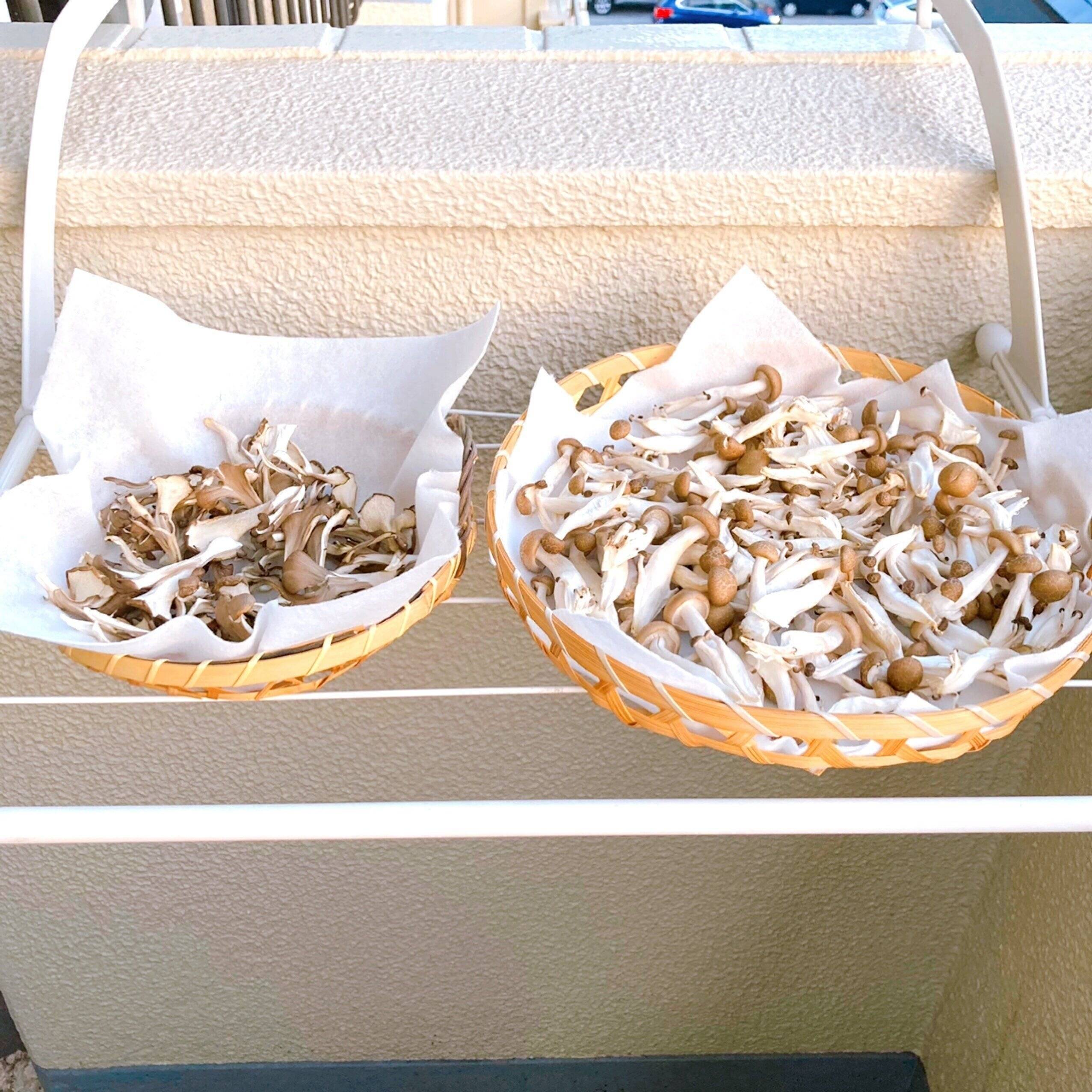 きのこは、【ざるなどに広げて】おきましょう。盆ザルなどにキッチンペーパーを敷いて、しめじやマイタケは石づきを取り除いて広げます。しいたけはそのままで大丈夫です。
