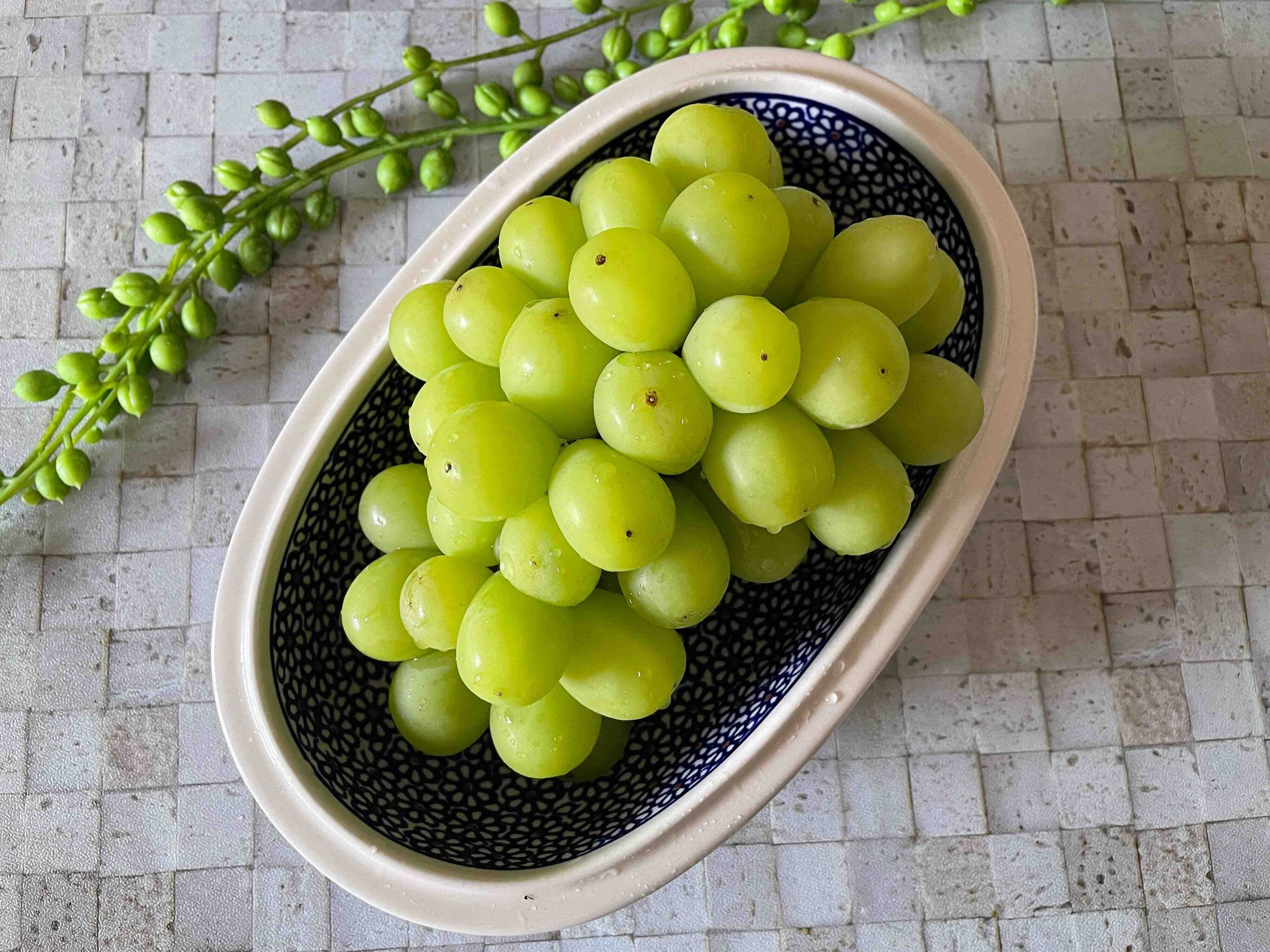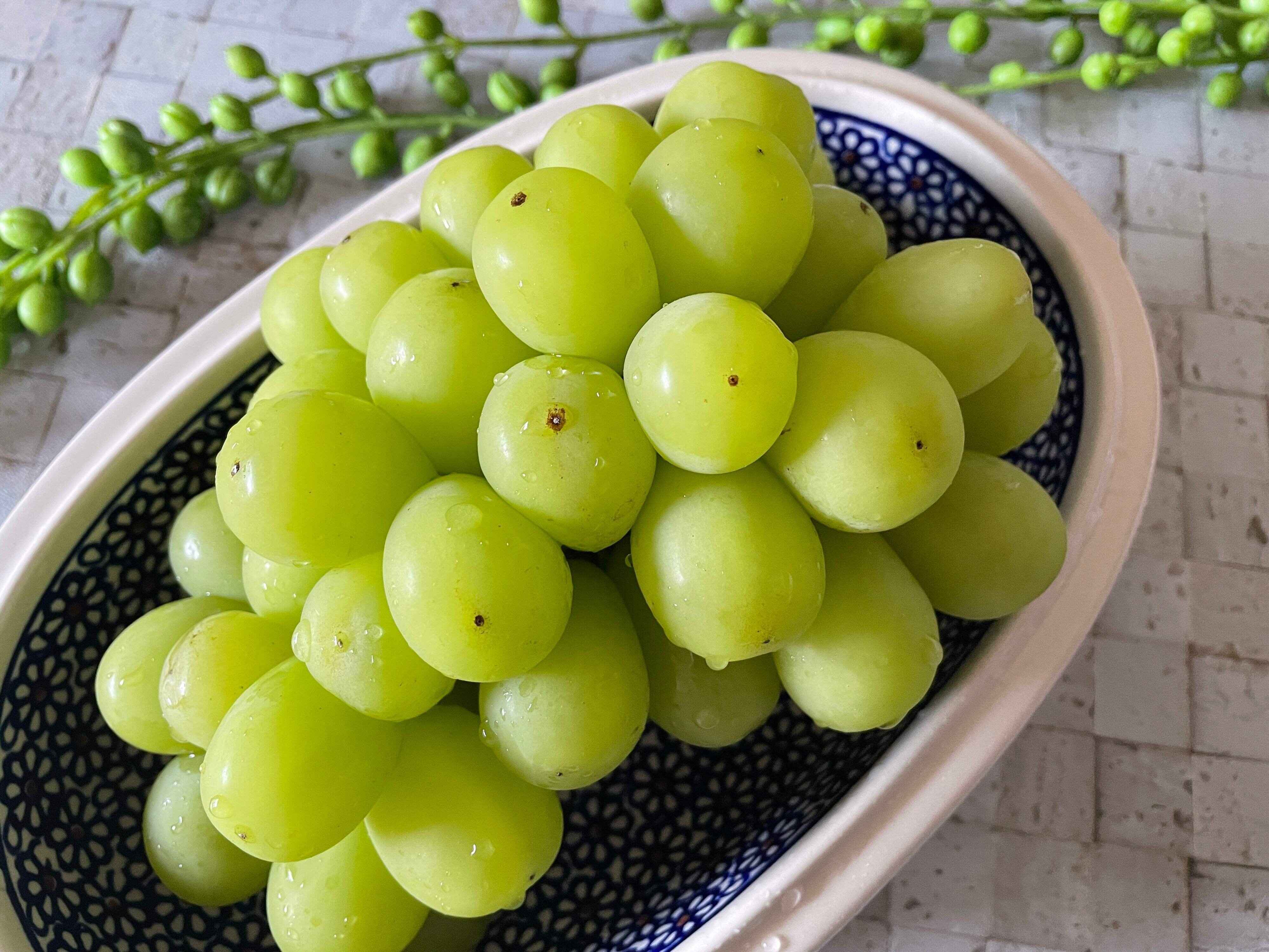 皮が薄くてパリっとしていて、噛むと中から果汁があふれだします。甘~い!!コレコレ!これがシャインマスカットですよね。本当においしくて幸せです。