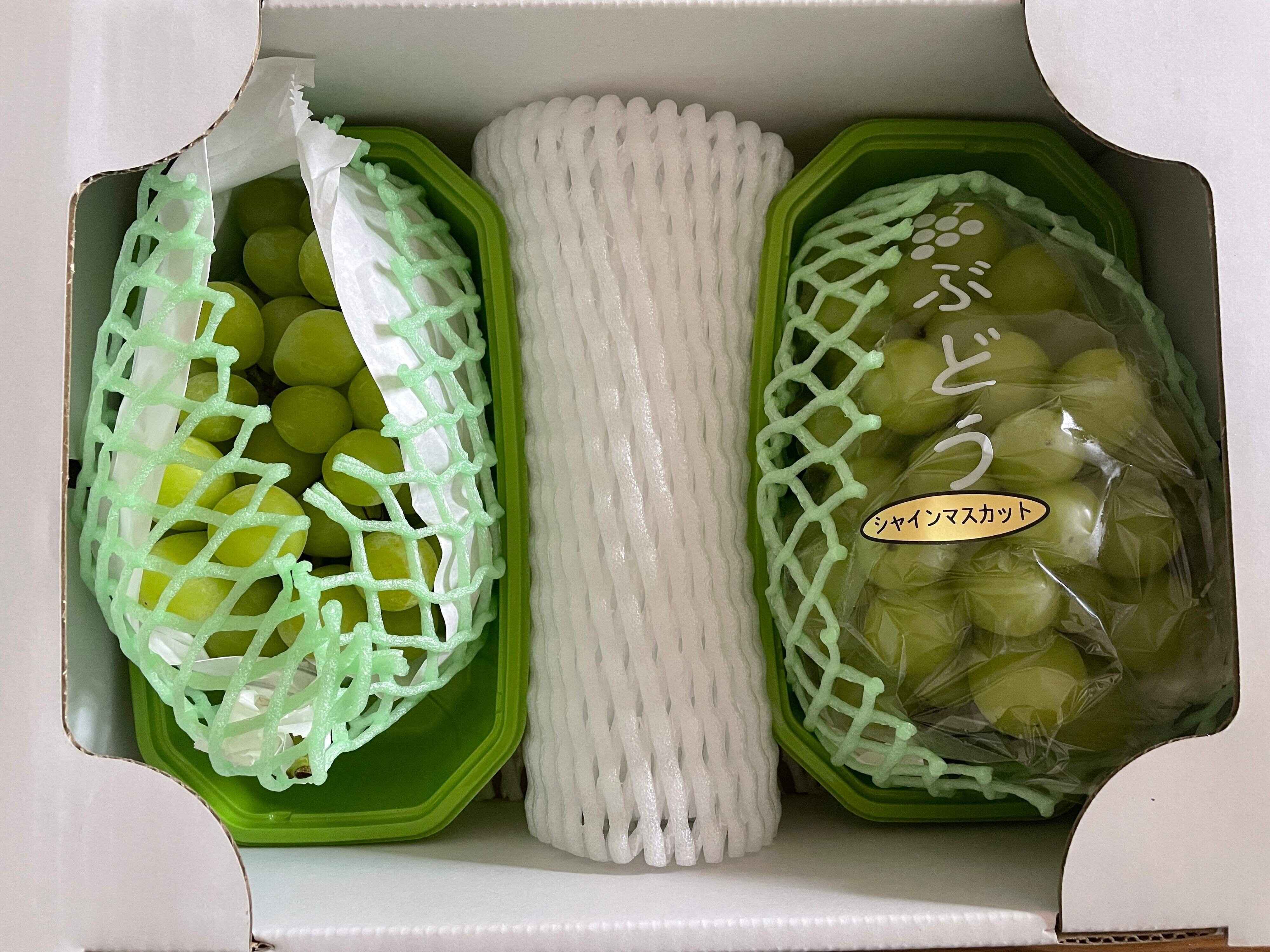 今年の春ごろ申し込んで、9月の頭に到着しました。大きくて重いシャインマスカットが2房!!