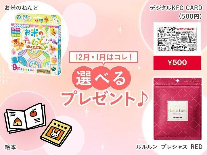 ケンタッキーフライドチキン500円デジタルカードやお米のねんど、フェイスマスクなど4種から選べるプレゼントつき!